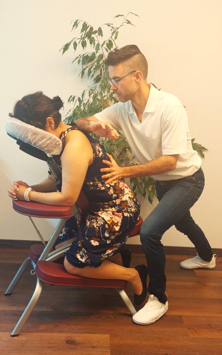 De massage vindt dus plaats in een speciale massagestoel, zodat je comfortabel zit terwijl ik spanning uit nek, schouders en rug weg werk.